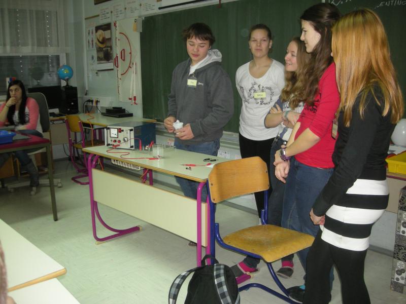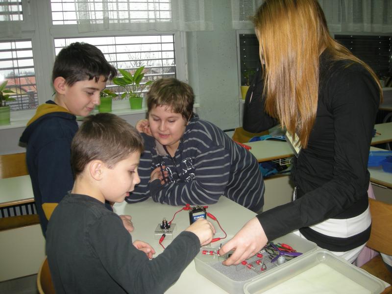 Učenci so se razdelili v pet skupin, kjer je vsak od učencev sestavil električni krog z žarnico in  baterijo, da je žarnica zasvetila. Enako so naredili s propelerjem ter zraven vključili še stikalo. V skupinah so se učenci tudi pozabavali z železnimi opilki ter žebljički, ki jih privlači magnet.