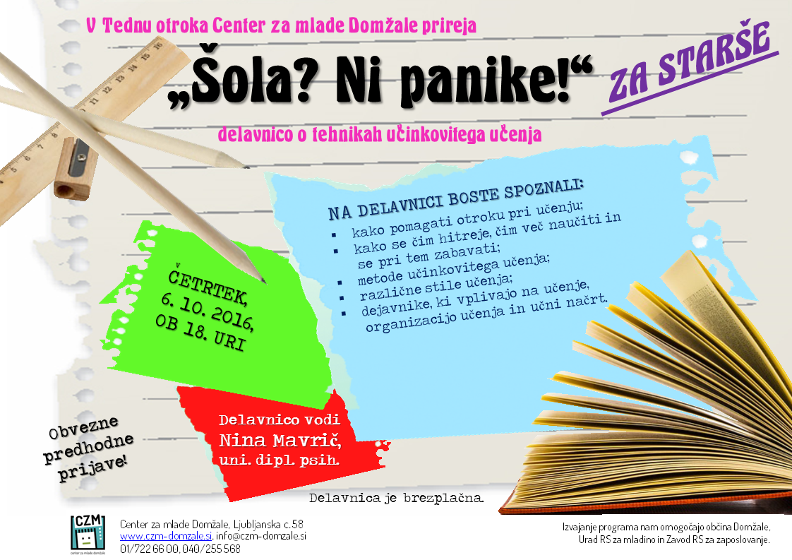 Center za mlade Domžale vas vabi na predavanje Nine Mavrič, uni. dipl. psih., z naslovom Šola? Ni panike!, ki bo potekalo v prostorih Centra za mlade Domžale v četrtek, 6. oktobra, ob 18. uri. Gre za predavanje, ki je namenjeno staršem in strokovnim delavcem, in na katerem bodo predstavljene metode učinkovitega učenja.